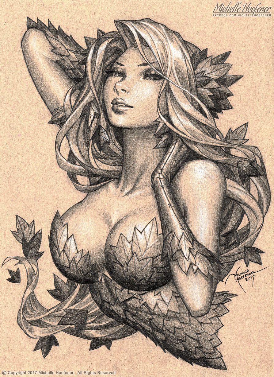 In that location's something inherently professional person looking with a piece of art like this, utilizing simply the colors of a pencil, using shading rather than colors. Blackness and white as an austere is middle-communicable in a way that you lot wouldn't wait. Michelle Hoefener does a fantastic job of calculation the cascading leaves from Ivy'due south pilus, making information technology look like she was a tree amongst a tumultuous Fall. The best role may be that await in her eye though, one of a predator who knows they've ensnared their prey.